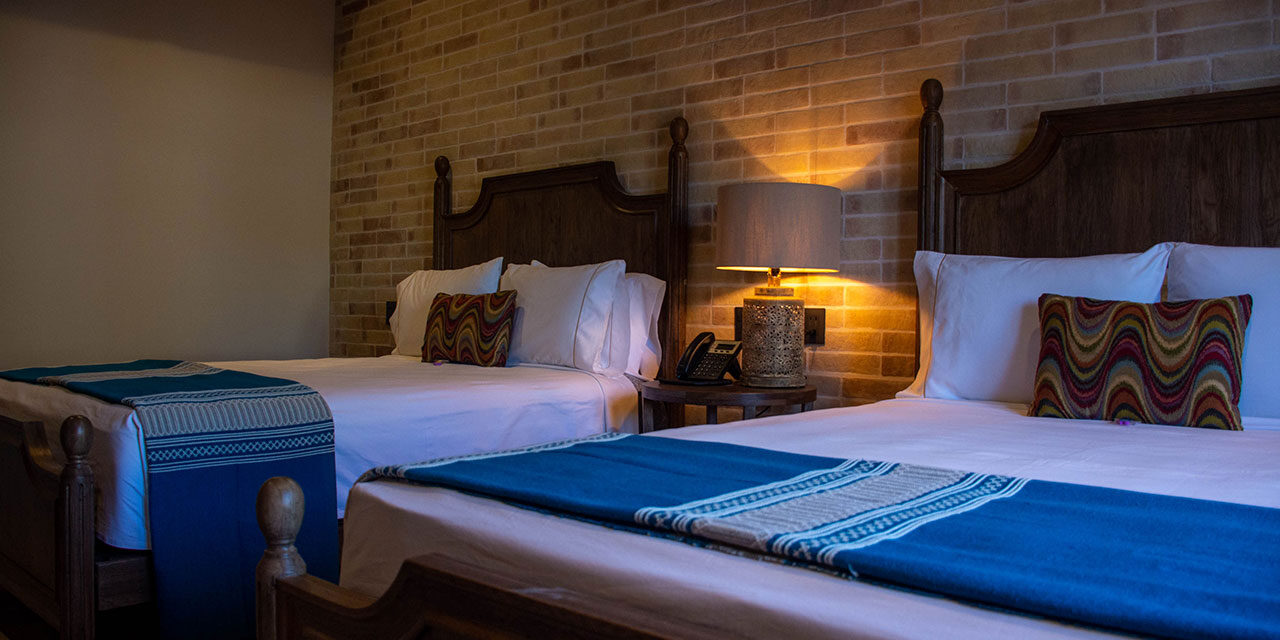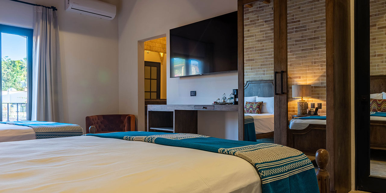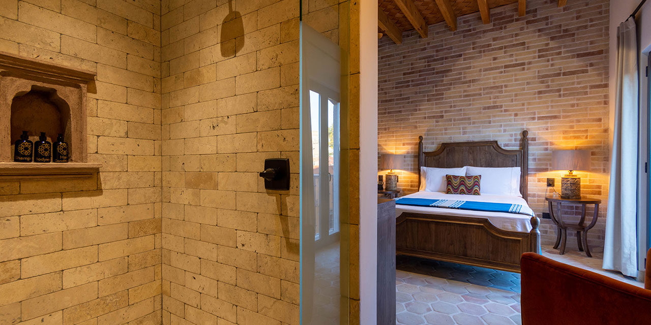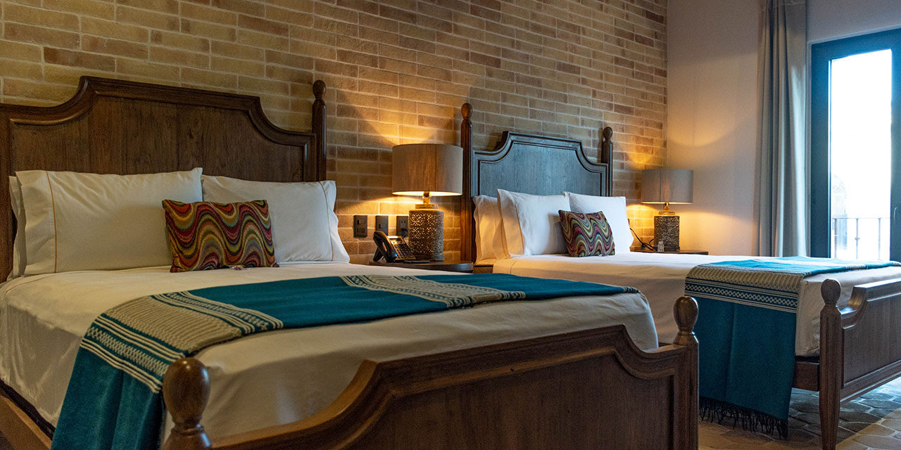 La lujosa habitación de 32 m² está dotada de una cama King size o dos camas queen size con un cabeceras de madera rústica, con muebles eclécticos de época, pisos de cantera avejentada y sus fabulosos elementos arquitectónicos que terminan fusionándose con la decoración clásica y elegante te harán sentir en un atmósfera acogedora y de vanguardia.