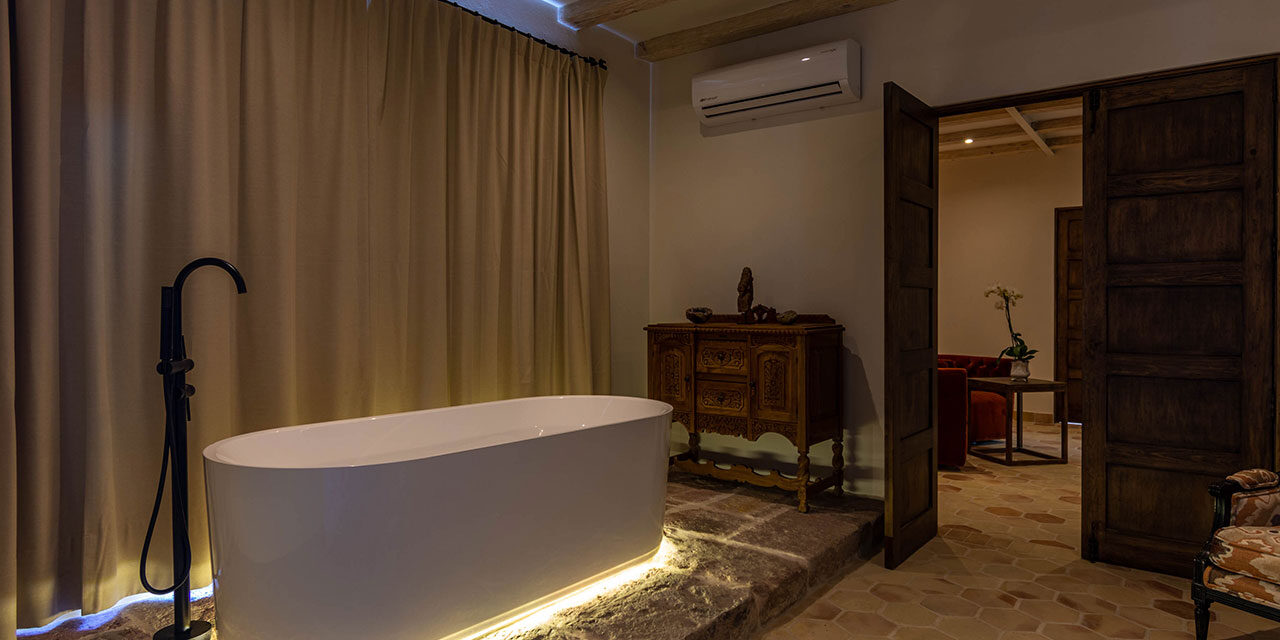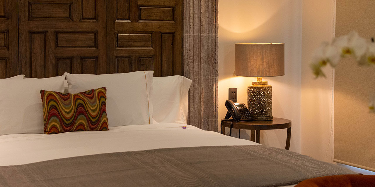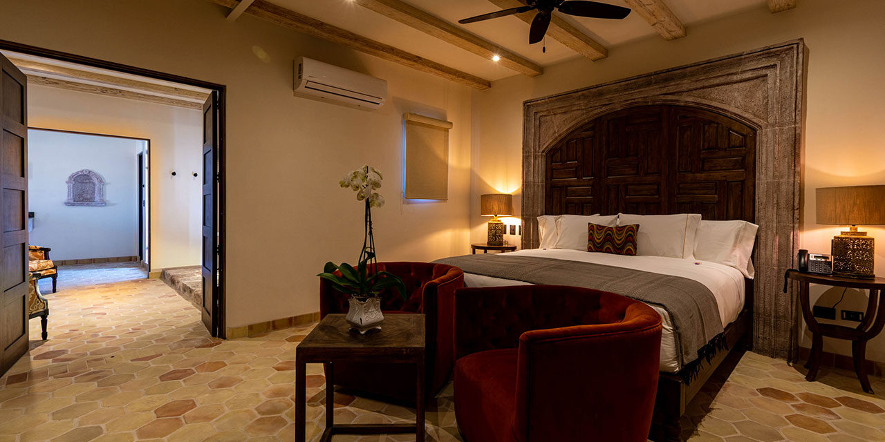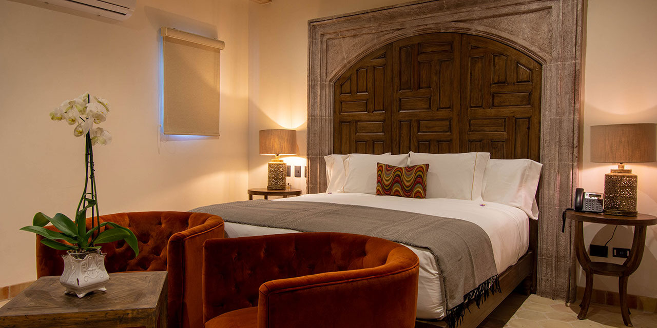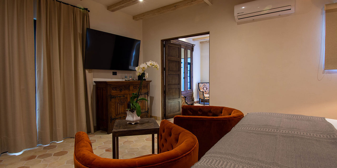 La lujosa habitación está dotada de una cama King size con un cabecero de madera rústica con muebles eclécticos de época, pisos de cantera avejentada y sus fabulosos elementos arquitectónicos que terminan fusionándose con la decoración clásica y elegante le harán sentir en una atmósfera acogedora y de vanguardia.